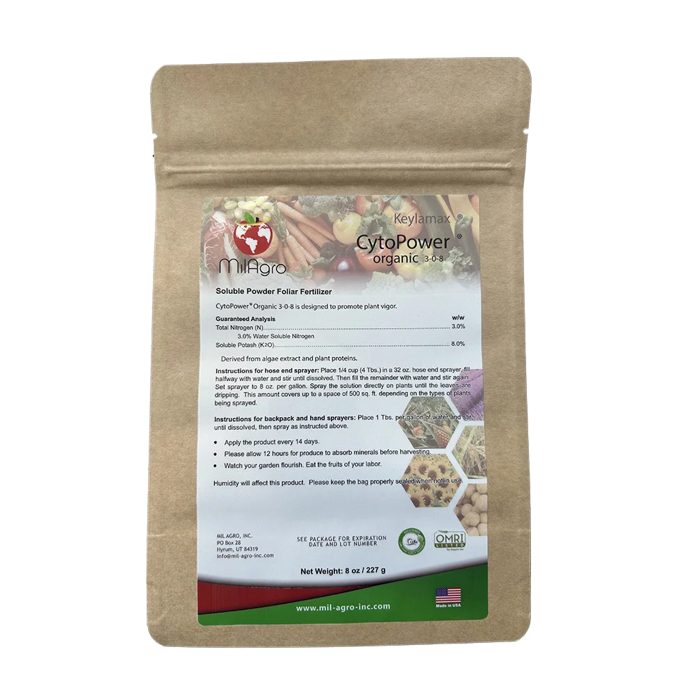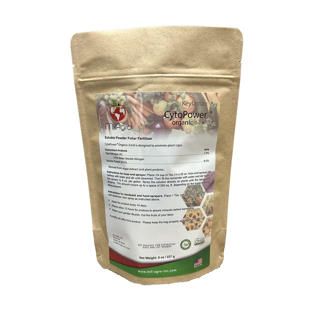Keylamax CytoPower is an organic biostimulant that will keep your plant working during times of stress. When temperatures get hot, days short, or you simply want to maximize your production, CytoPower is going to be the key for your gardening success. CytoPower contains a mix of plant foods and stimulants that will keep your plant healthy and working all year long. CytoPower will also act as a booster to all our other products. Best results are seen when mixed and applied with our MultiMax product. Typical application rate is 1 tablespoon per gallon. Spray on plants till well wetted/dripping.